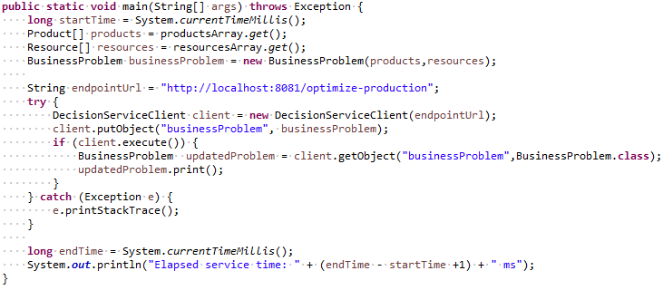Now I needed to create a Java test that will execute this service and will be a prototype for an implementation of the button “Optimize” in my GUI. OpenRules Decision Manager provides the standard class “DecisionServiceClient” (publicly available from the GitHub repository “openrules.tools”) that is usually used to create custom clients for remote OpenRules services. So, I created the following Java class “SimpleClient” to test my server: