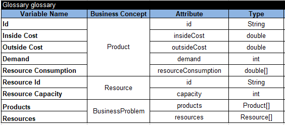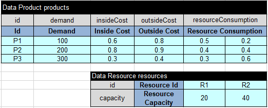 The basic implementation of such service (limited to hard-coded 2 resources and 3 products) was already available from JavaSolver. So, I only needed to teach it how to accept any arrays of products and resources using the REST API. It can be easily done if I wrap the basic Java implementation into a standard OpenRules Decision Manager. So, I copied the standard project project “VacationDaysSpringBoot” into a new project “InsideOutsideProduction”, removed all rules, and added the following Excel-based test data: