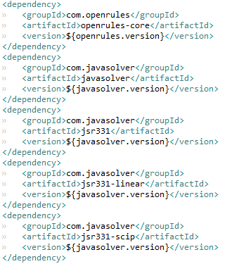 I only need to adjust my Maven’s “pom.xml” file by adding dependencies to JavaSolver and selecting an underlying linear solver (I decided to start with the solver “Scip”):