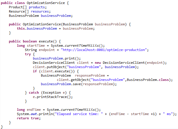 So, now I needed to go back to my GUI, and similarly implement the button “Optimize”. First, I created a new Java class OptimizationService in my OpenRules Dialog project “InsideOutsideProduction”. It looks very similar to the SimpleClient but instead use test-objects defined in Excel it uses Java objects passes from the GUI: