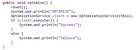 Now I only needed to associate the the botton “Optimize” with this services. To do this, I added the following method “optimize()” of my internal class UserInterface (that so far was empty):