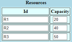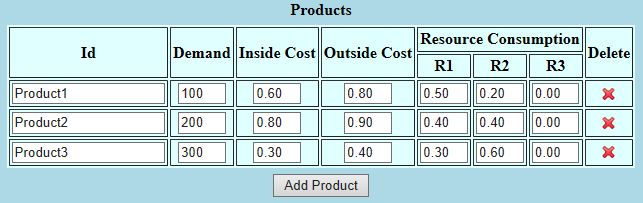 In this table a user may add (delete) as many products as he/she needs, and for each of them enter Inside/outside production costs, demand, and resource consumption. The resource availability can be defined in the following table: