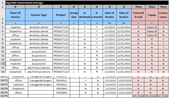 If you click on this image, you will open the actual table in Excel and will see that it contains 16,372 rows (rules) and this Excel file occupies almost 3 MB. So, it is quite a big table. You may execute this table against different combinations of input parameters using this online GUI: