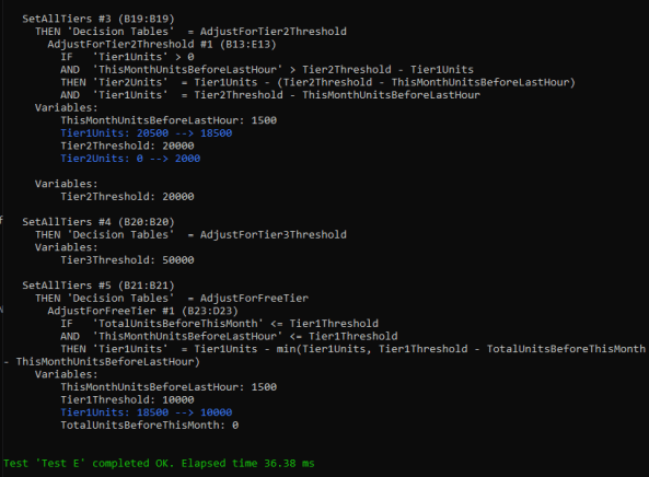 Then I called the default “test.bat” to execute this decision model and received the following results (shown only for the most complex Test E):