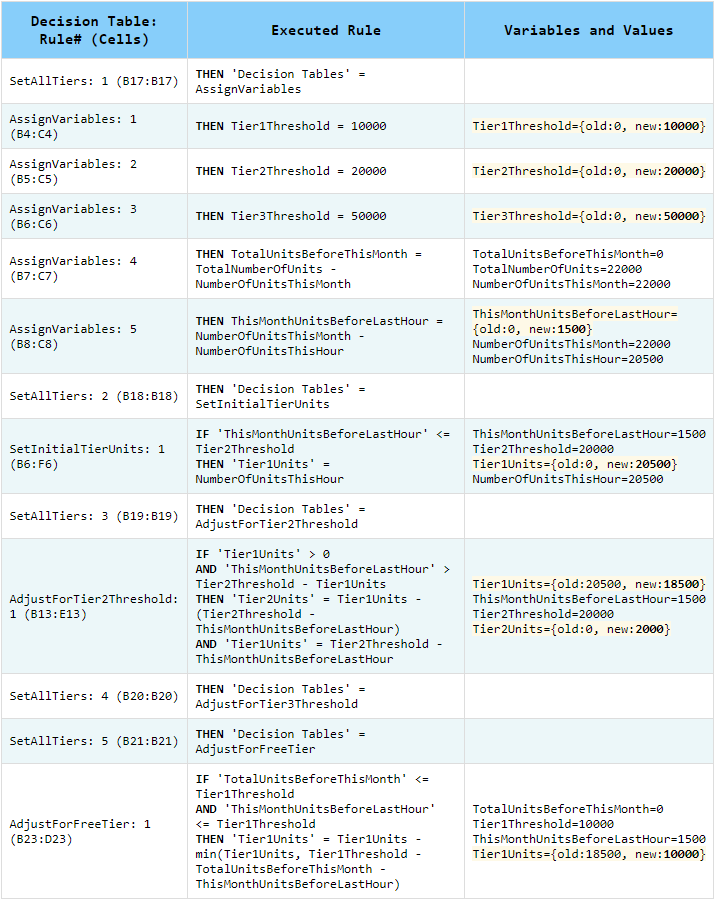 Blue color highlights the decision variables that were actually changed showing their values before and after rules execution.