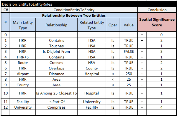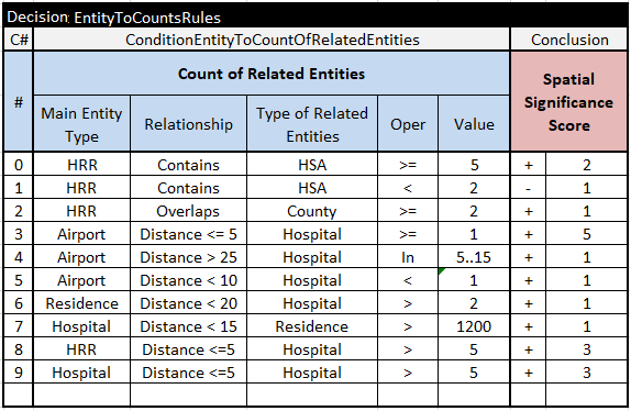 Another type of spatial decision tables dealt with the business rules that specify the Spacial Significance Score based on the number (count) of entities related to the main entity: