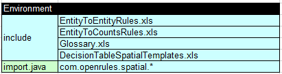 It contains an include-statement that refers to the file “DecsionTableSpatialTemplates.xls” with the above two template tables. To access the Java class GeoDatabase that we developed as a part of the the Java package “com.openrules.spatial”, this table contains an “import.java” statement that refers to “com.openrules.spatial.*”.