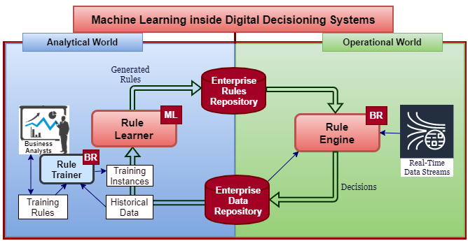 You can read more about it here. And in many practical cases it is the right architectural approach to a decisioning system to cover two different worlds: Analytical (where ML algorithms are used) and Operational (where a decision engine utilizes the latest business rules produced in the analytical world).