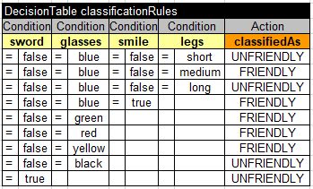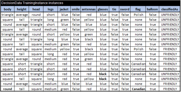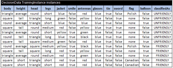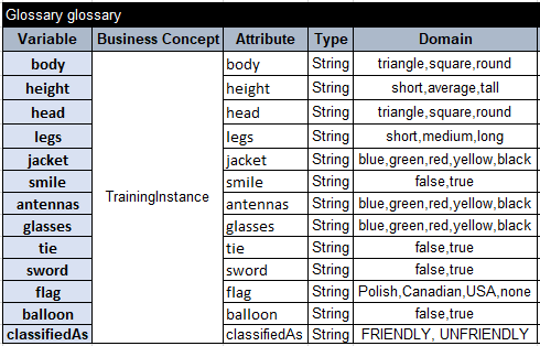 With Rule Learner, we usually represent the problem in two Excel tables. The first one describes all known instances of the problem and in this case it looks as follows: