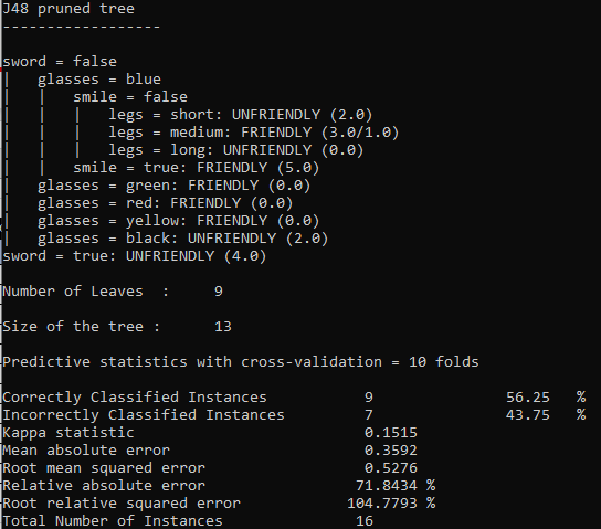 Applying machine learning algorithms to real-world problems for years, I know that automatically learned usually could suffer from over-fitting and it’s better to assume that they are far from perfect. It is especially true for small training sets like this one. No wonder, that the applied ML algorithm C4.5 produced these statistical metrics: