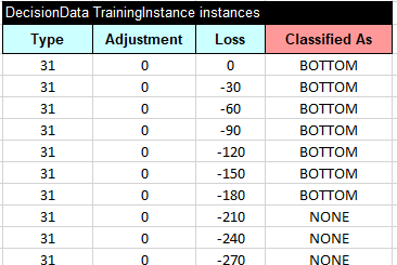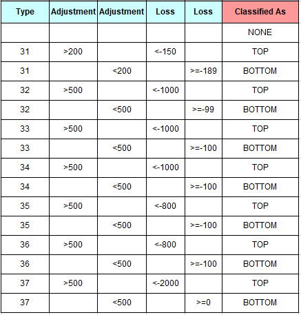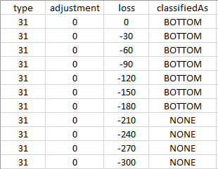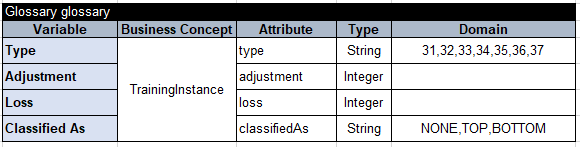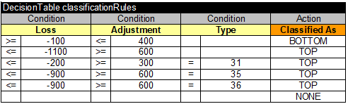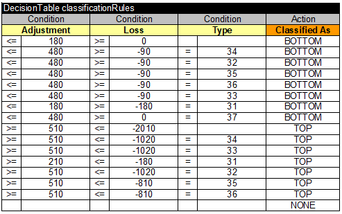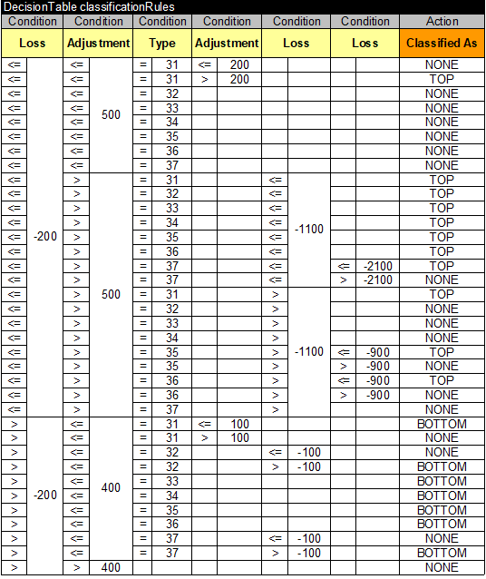 Data Instance Generation. Many decisioning platforms (e.g. SAPIENS, Corticon) can automatically generate test instances for given business rules. In our case, it was a very simple task: we can navigate through all possible types from 31 to 37, the through possible adjustments from 0 to say 800 with a certain step, e.g. 30, and then through possible losses from 0 to -2500 with a step=-30. So, I quickly wrote a Java program with 3 embedded loops that looks as follows: