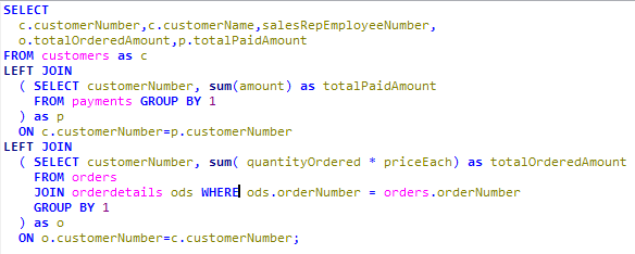 If we remove it, the query will produce many records with NULL order’s status and payment’s amount. This knowledge along with two joins constitutes “technical logic” of the database organization. Alternatively, the condition