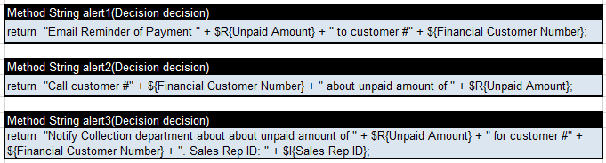 In real-world application that uses this decision model we don’t need these functions as the application that invokes our decision model will probably generate emails using the value of decision variables such as Financial Customer Number, Unpaid Amount, Sales Rep ID, etc. produced by the decision model.
