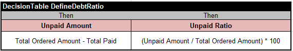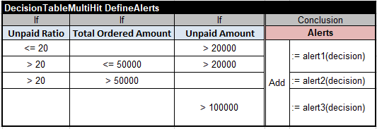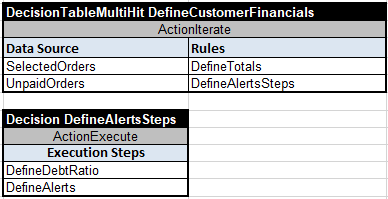 As we want for every selected record execute two decision tables “DefineDebtRatio” and “DefineAlerts”, we added an intermediate table “DefineAlertSteps”. Note that we also made our table to be multi-hit to execute rules for both “SelectedOrders” and for “UnpaidOrders”.
