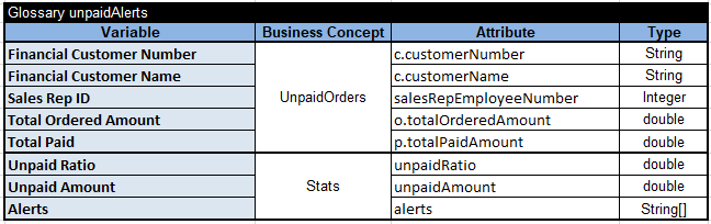 This query specify a selection criteria only and doesn’t define any business logic for the selection of the unpaid orders among the selected records – we want to define this logic directly in business rules. First, let’s move this query to the Excel table of the type “DataSQL” called “unpaidOrders”: