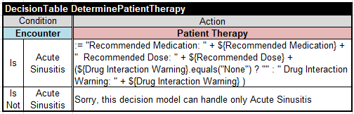 Of course, everybody would prefer one of two first decision tables to Java snippets. However, all 3 above tables will always produce “Drug Interaction Warning” even when it is “None”. So, if you don’t want to display the warning “None”, you may use adjust the Java snippet as follows: