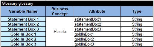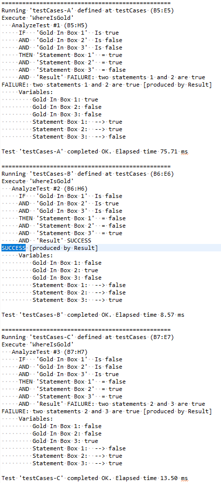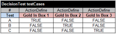 I decided to run 3 test cases by placing gold in Box 1, 2, or 3 and let rules to check which test produces the result as CONFLICT or SOLUTION. So, I’ve created one Excel file “DecisionModel.xls” with the following tables: