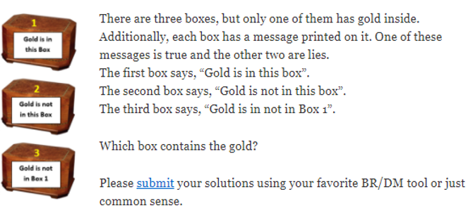 It will be even simpler if instead of 3 Boolean variables Gold In Box 1, Gold In Box 2, and Gold In Box 3 I’d use only one Integer variable “Gold In Box” with possible values 1, 2 , or 3.