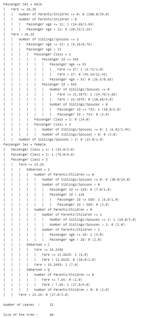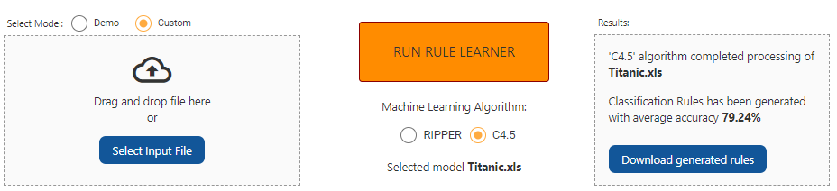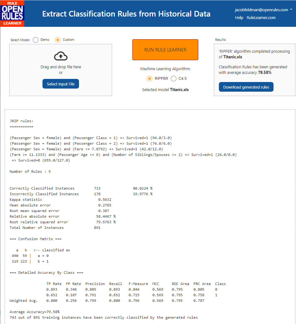 This file has 891 training instances. I was able to run Rule Learner as a SaaS directly from AWS: https://saas.rulelearner.com/. I don’t need to download anything. I simply uploaded the file “Titanic.xls” with these two tables inside. Then I clicked on the button “RUN RULE LEARNER”. It applied the default ML algorithm RIPPER to quickly produce the classification rules as shown below: