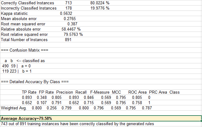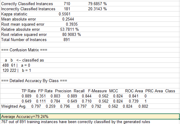 As you can see the average accuracy is almost the same (79.24%) but the generated rules are completely different because C4.5 generates a decision tree: