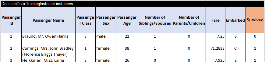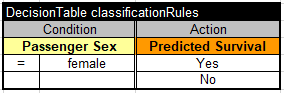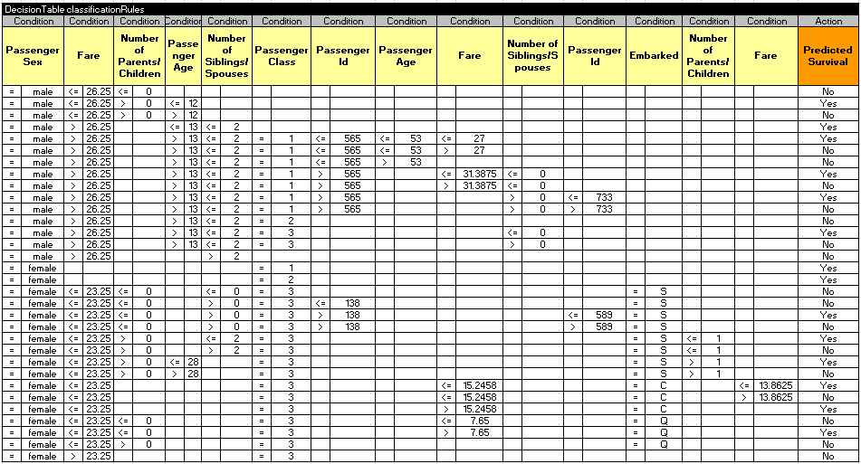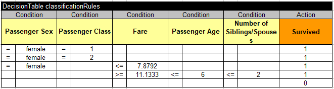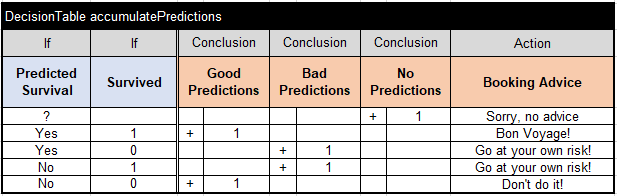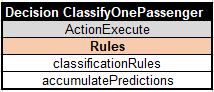 The decision table “accumulatePredictions” is already defined above, and now we also specified the name of the decision table “classificationRules” that will be used to determine Predicted Survival of each passenger.
