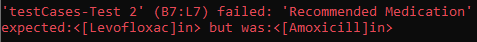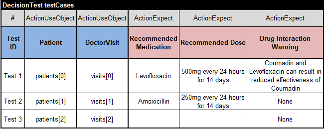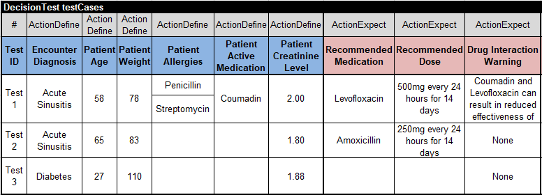 Blue columns of the type “ActionDefine” provide test values for input decision variables. Reddish columns of the type “ActionExpect” provide expected values for the proper output decision variables. If the expected values do not match the actual values produced during the decision model execution (using test.bat) OpenRules will display mismatches. For instance, if in the Test 2 you replace the expected Recommended Medication to “Levofloxacin”, you will receive the following error: