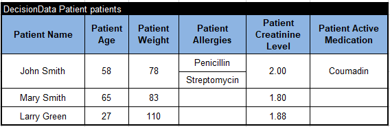 In the left top corner this table specifies its type “DecisionData” following the business concept “Patient” (defined in the Glossary) and the names of the array “patients“.
