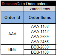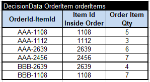 And the next DecisionData table defines an array of order that specifies which order items from the array “orderItems” belong to each order:
