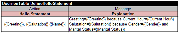 The second expression {{Greeting}}, {{Salutation}} {{Name}}! uses string interpolation when names of decision variables are taken into double curly braces to instruct OpenRules that they should be replaced with their values.
