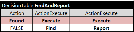 simply adds the proper error message to the array “Errors” if the variable Found was set to TRUE by the previous table. This representation is simple and intuitive. To invoke these two decision tables one after another with setting Found to FALSE I created this table: