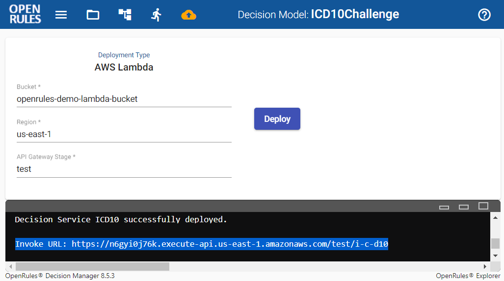 I selected the Deployment Views, and clicked on the button “Deploy” (I could do the same using the standard file “deployLambda.bat”). It created a new Lambda function using an AWS OpenRules account with the endpoint URL highlighted below in blue: