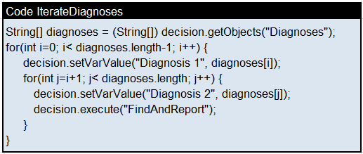 How to invoke FindAndReport for different pairs of diagnoses reported in the claim? This is not a trivial question. Being a Java developer, it was quite easy for me to write this Java method (still in Excel):
