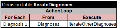 Here is how I replaced the above Java code “IterateDiagnoses” with the following decision tables which use the latest OpenRules “ActionLoop“: