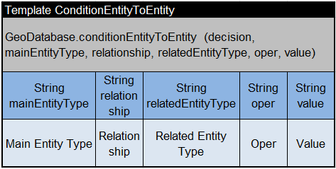This template describes the structure of the above custom condition and hides its implementation in the Java method that leverages a standard GIS Java library GeoDatabase. You can read more about this particular implementation here. It is quite easy to similarly create templates for any custom conditions and actions.