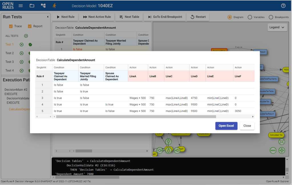 Now authors of decision models may see all their decision tables directly in our IDE even without opening the underlying Excel files, execute their rules one-by-one, and see the dynamic execution path on the diagram with all related decision variables: