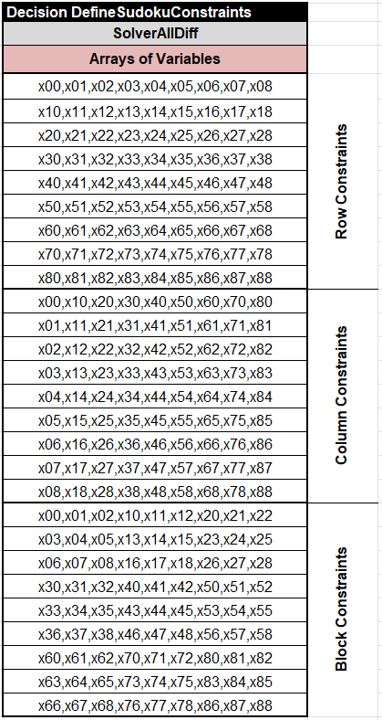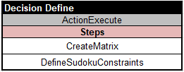 Step 2 “CONSTRAINTS”. The most important second step “DefineSudokuConstraints” effectively utilizes the predefined column type “SolverAllDiff” which ensures that no two variables inside the provided list can have the same value (All Different):