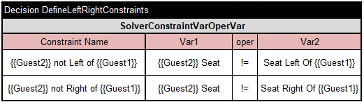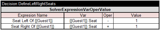 We still need to define Solver’s expressions for “Seat Left Of {{Guest1}}” and “Seat Right Of {{Guest1}}”. It can be done in the following table: