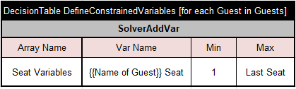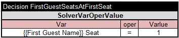 We will assume that seats are numbered from 1 to 16, 32, 64, and 128. The Last Seat is calculated in the above Glossary as a number of elements in the array of Guests. For each Guest, we will create unknown decision variables with names “{{Name of Guest}} Seat” (e.g. “1 Seat”, “2 Seat”, etc.) that can take values from 1 to Last Seat. We call these unknown variables “Solver’s variables”. Using Rule Solver, we can create these variables and put them into an array “Seat Variables” using the following table: