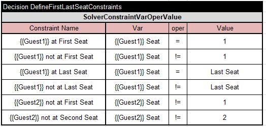 Here {{Guest1}} and {{Guest2}} will be replaced by the actual names of Guest1 or Guest2. We still need to define the constraints like “{{Guest1} at First Seat” and others. It can be done in the following tables: