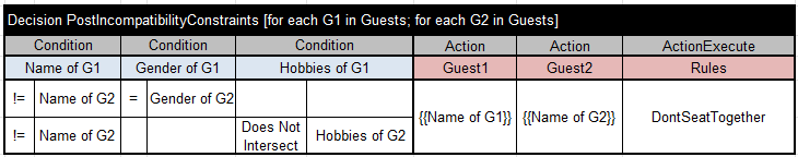 To post Gender and Hobby constraints we need to consider all possible pairs of Guests (G1;G2) and state that G1 and G2 should have opposite genders and at least one common hobby. We can do it by posting incompatibility constraints (“DontSeatTogether”) for each pair of different guests G1 and G2 if they have the same Gender or (!) their Hobbies do not intersect. Here is the proper OpenRules table with two nested loops over the same array Guests: