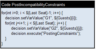 Note that we implemented the above “or” by using two different rules. In both situations we will execute the same Action “DontSeatTogether”. This action is supposed to post the following IT-THEN constraints that would not allow Guest 1 and Guset2 to seat next to each other: