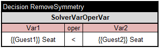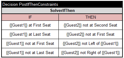 Note that we implemented the above “or” by using two different rules. In both situations we will execute the same Action “DontSeatTogether”. This action is supposed to post the following IT-THEN constraints that would not allow Guest 1 and Guset2 to seat next to each other: