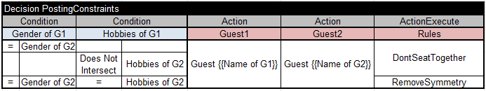 To post Gender and Hobby constraints we need to consider all possible pairs of Guests (G1;G2) and state that G1 and G2 should have opposite genders and at least one common hobby. We can do it by posting incompatibility constraints (“DontSeatTogether”) for each pair of different guests G1 and G2 if they have the same Gender or (!) their Hobbies do not intersect. Here is the proper OpenRules table with two nested loops over the same array Guests: