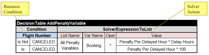 The main idea of the proposed approach is to introduce new types of decision table columns that define constrained variables and their relationships. It allows a user to mix and match business rules with technical constraints within the same decision tables. This approach has been implemented in a new OpenRules RuleSolver. Here is an example of a decision table with a business condition and a solver action: