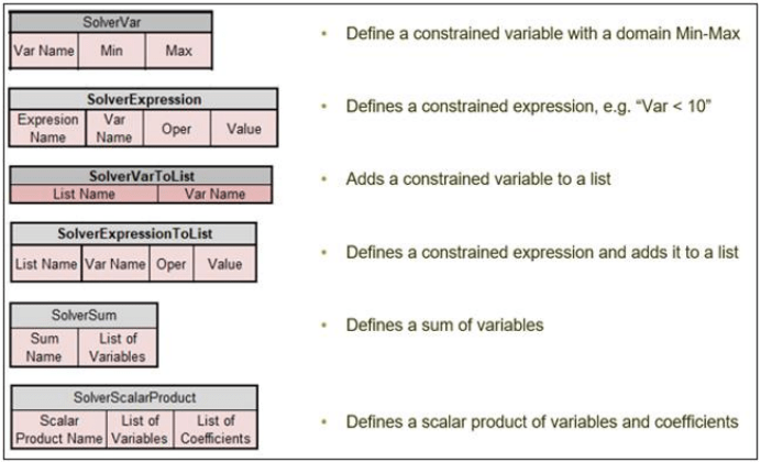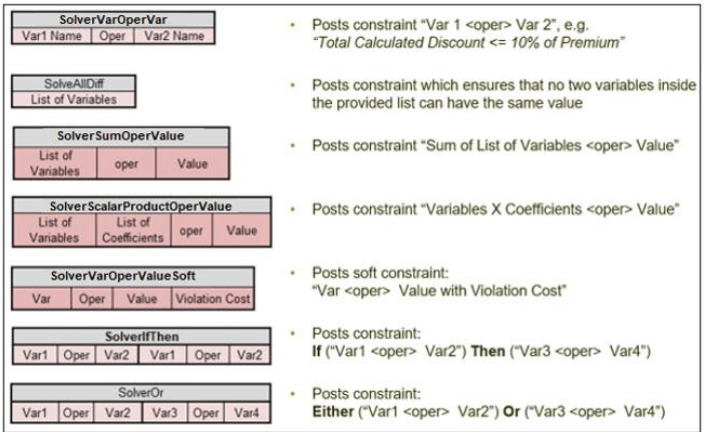 Rule Solver extends DMN-like decision tables with predefined actions on collections such as “All Different” and predefined search methods. All RuleSolver’s column start with the prefix “Solver”. Here are examples of the predefined Solver’s columns and methods: