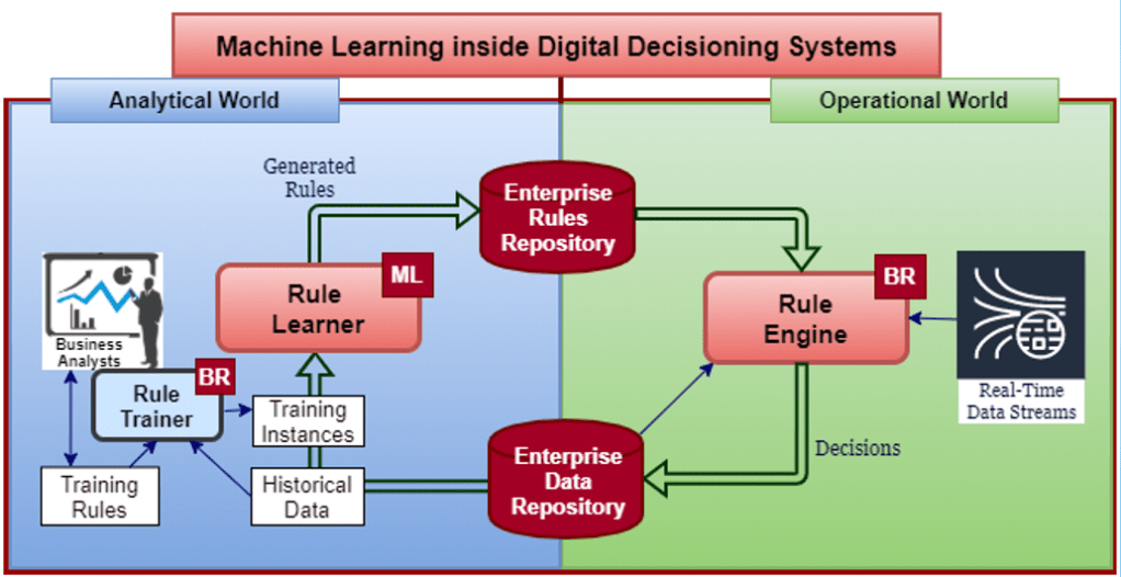 Here again, we take advantage of the fact that the majority of decision-making applications have a clear separation between Analytical and Operational worlds: the first one is discovering, representing, testing, and constantly updating business logic using business rules while the second one executes rules-based decision services.