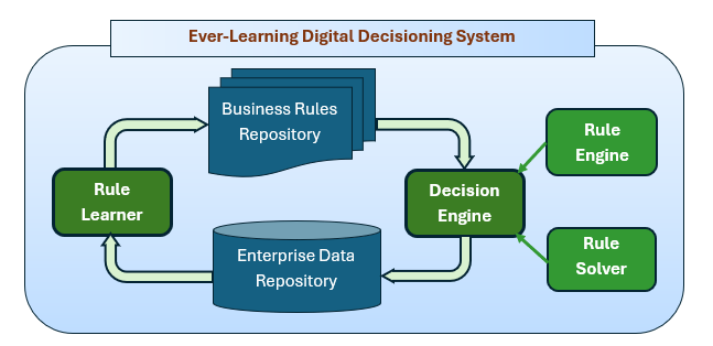You can see how Rule Learner works on the cloud and even apply it to generate business rules from your historical data without any installation. Rule Learner supports the ever-learning decisioning systems described in the following architectural schema: