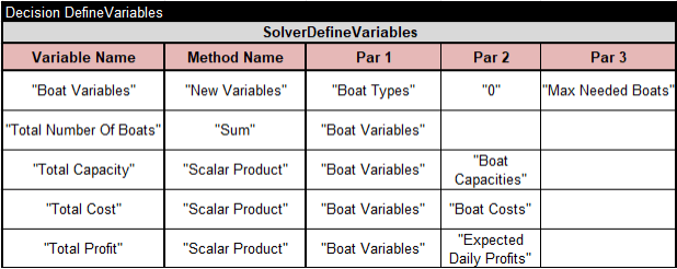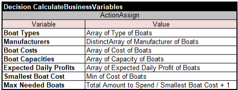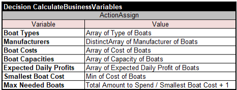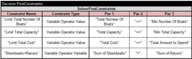 This is the standard OpenRules decision table with an iteration loop over Boats. For each Boat, it uses Boat’s Type (“Speedhawk”, “Silverbird”, “Catman”, or “Classy”) to add a new Solver’s decision variable to the proper array of yet unknown variables. Then we can post the major problem constraints using this decision table: