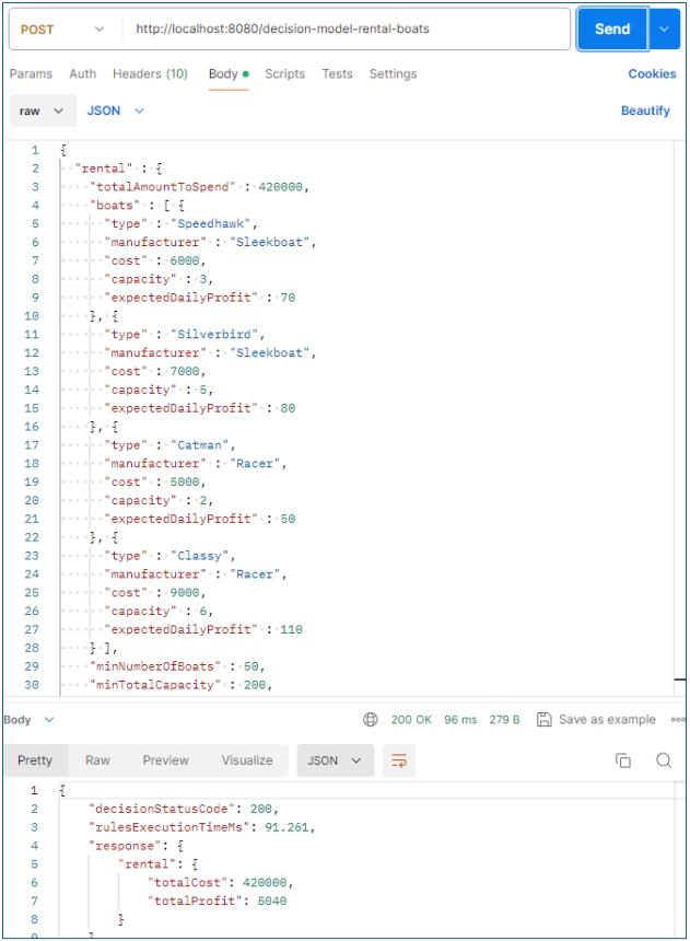 I especially like that building and executing the decision model all the time we remain inside the standard OpenRules Decision Modeling environment oriented to subject matter experts. In particular, it didn’t require any extra effort (just one click!) to deploy this model as a RESTful decision service, and test it with POSTMAN: