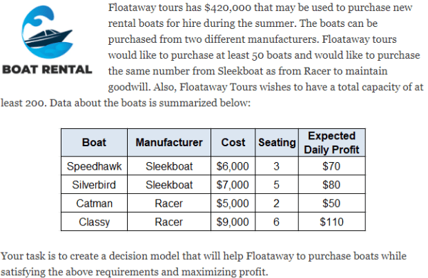 You may look at multiple decision models from Simple Arithmetic Problems to Smart Investments to see how Rule Solver helps define business optimization problems and produce their optimal solutions. One such decision model was created by our intern to ponder the DMCommunlity Challenge “Rental Boats“.